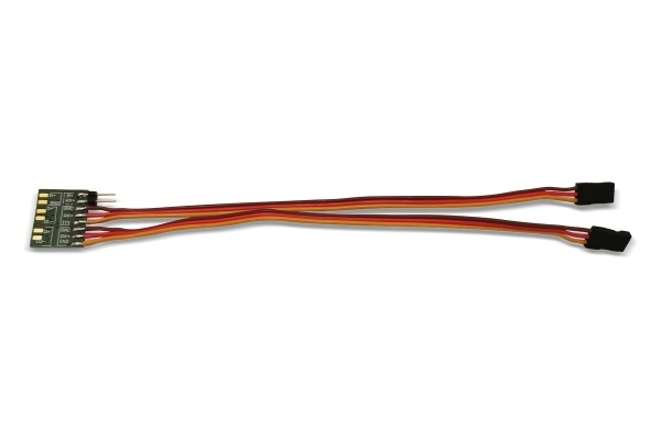 Technische Daten: • Betriebsspannung (über Empfänger): 4,0 – 8,4 V • Externe Spannungsversorgung: 4,0 – 21,0 V DC • Max. Schaltstrom pro Kanal: 7,5 A • Max. Schaltspannung: 21 V • Abmessungen: ca. 16 × 21 × 5 mm (ohne Kabel) • Gewicht: ca. 8 g • Benötigte Steuerkanäle: 2 Schaltkanäle